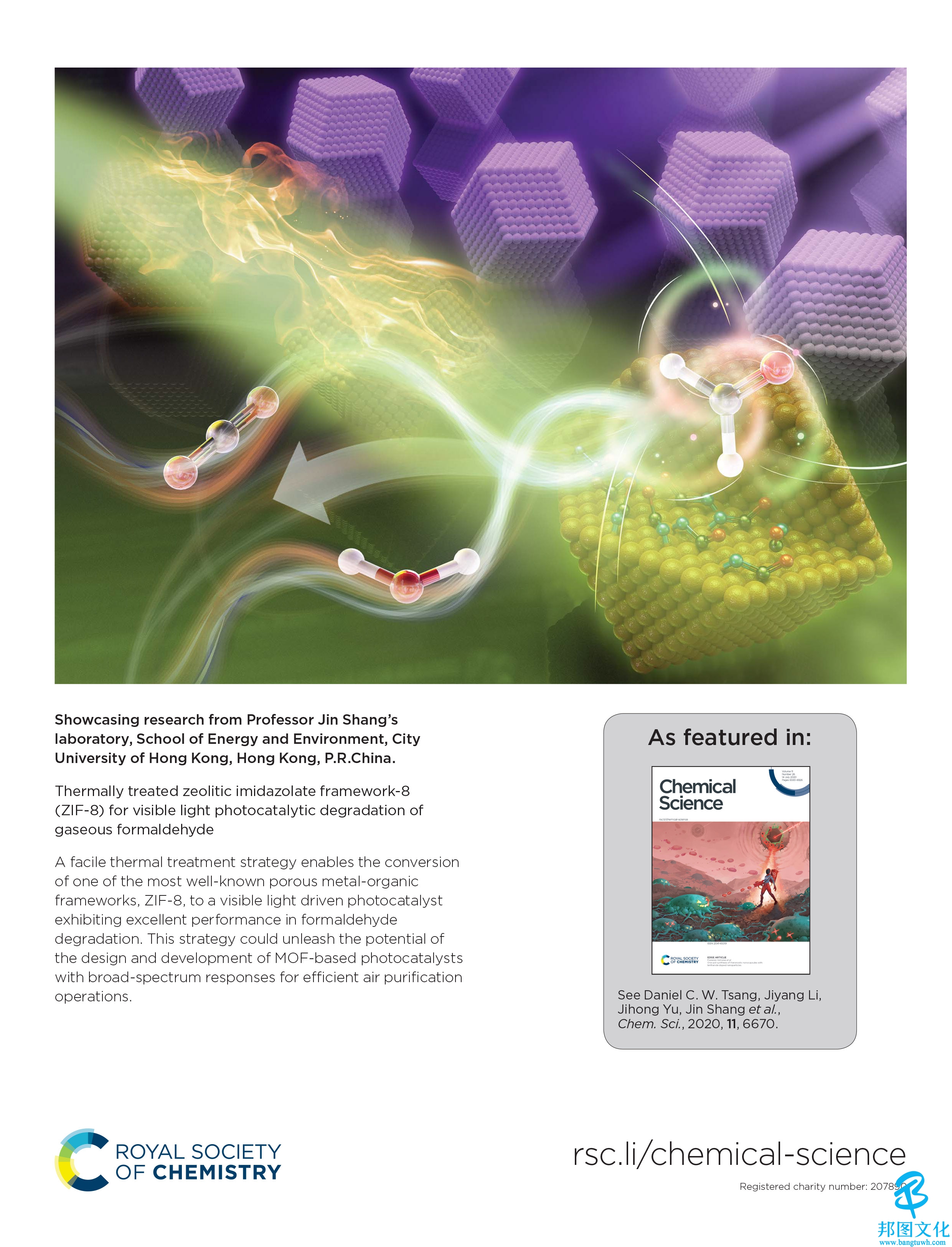 主要讲的是利用热处理后的zif-8 (mofs的一种)多孔材料,作为光催化剂,在可见光的照射下降解空气中的甲醛气体。普通的zif-8(未经热处理,白色),只能被紫外光激发,而紫外光仅占太阳光谱的4%。热处理后的zif-8(棕色)的光吸收能力明显提高,可以被可见光激发,可见光占太阳光谱高达40%左右。